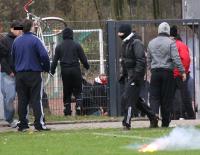 Zahlreiche Randalierer versuchten über den Zaun zu gelangen, andere warfen Fahrräder, Äste, Regenschirme, Schaufeln sowie eine Eckfahne auf die Dortmunder. Ebenfalls schossen beide Seiten mit Leuchtraketen aufeinander. Spieler und Zuschauer, darunter zahlreiche Kinder, brachten sich in Sicherheit.