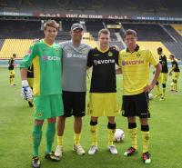 Jürgen Klopp mit den BVB-Zugängen Robert Lewandowski, Lukasz Piszczek und Mitch Langerak (v.re.)