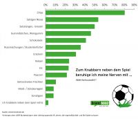 Und auch Knabberzeug darf beim Fußball nicht fehlen. Mit salzigen Snacks wie Chips (80 Prozent) beruhigen die Deutschen ihre Nerven während des Spiels. Auch typisch für eine offizielle Fußballbegegnung: am Spielfeld vier Eckstangen, am Sofa 400g Salzstangen. Denn Salzstangen und Nüsse stehen bei rund der Hälfte aller Fußballschauenden (50 bzw. 53) immer griffbereit auf dem Tisch. Zu einem spannenden Fußballspiel gehören für die Hälfte der Deutschen auch jede Menge Weingummis und Gummibären zur Nervenentspannung.