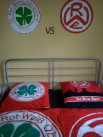 Auf einer An- und Verkauf-Seite bei facebook tauchte dieses Bett auf, für 15 Euro kann es erstanden werden. Doch nicht das Bett hat unsere Aufmerksamkeit erregt, vielmehr die geteilte Bettwäsche. Rechts Rot-Weiss Essen, links Rot-Weiß Oberhausen, die Rivalen aus dem Pott in diesem Fall ganz nah beieinander.