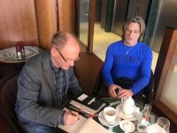 Interview auf Schalke: Norbert Elgert (rechts) mit Redakteur Peter Müller.