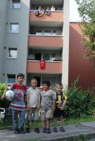 Keiner wollte Cristiano Ronaldo sein. Türkische Kinder vor einem beflaggten Hochhaus in Herne.